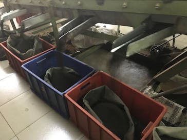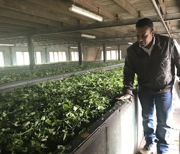 Grote houten bakken zijn gevuld met theebladeren. Via ventilatoren wordt warme lucht door het gaas geblazen waar de bladeren op liggen waardoor de bladeren drogen. Door het opschudden door een werknemer verkort je de droogtijd. Dit is de eerste stap van het verwerkingsproces. Van elke 5 kilogram aan groene theeblaadjes blijft uiteindelijk slechts 1 kilogram eindproduct over.