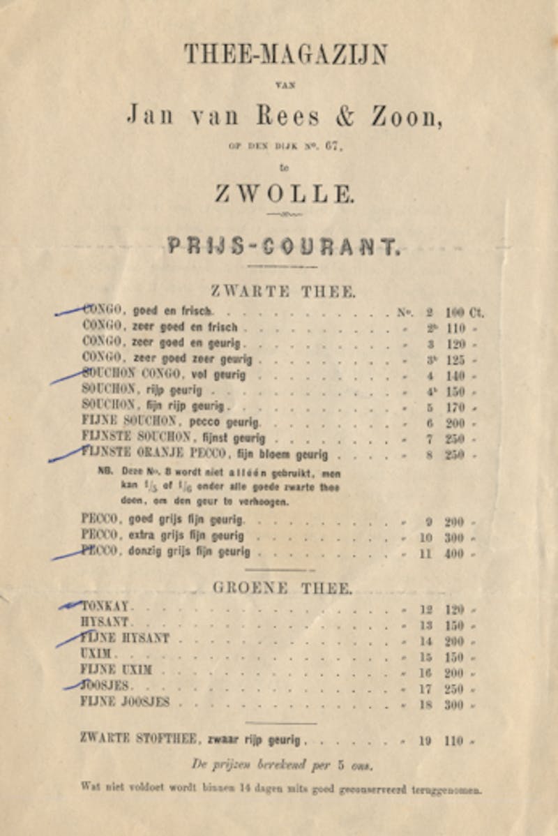 Het is 1819. Jan van Rees gaat met paard en wagen langs de deuren in Zwolle, om zijn thee aan de man te brengen. Hij verkoopt pakjes van 100 of 250 gram losse thee, die hij vermoedelijk via Engelse handelaars uit China en Indonesië haalt. De markt ligt open, nu er sinds twee jaar geen VOC-stempel meer vereist is om thee te mogen verhandelen. Zijn assortiment groeit en in 1870 verkoopt hij groene en zwarte thee, in verschillende kwaliteiten.